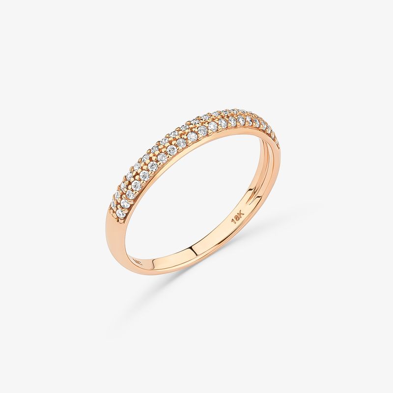 Esse anel meia aliança em ouro rosé 18k possui design sofisticado e 21 pontos de diamantes.