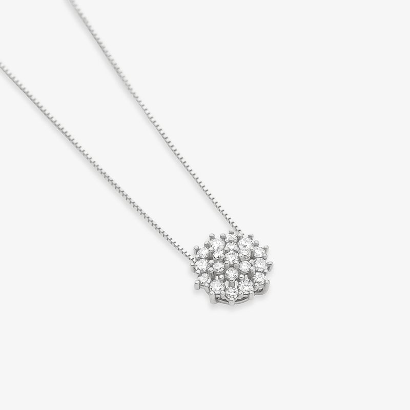 O Pingente com Diamantes em Ouro Branco 18K celebra a fluidez da Coleção Florence, com Diamantes em cravação chuveiro envolvendo um centro cintilante. O Ouro Branco 18K oferece uma joia em tons frios que faz brilhar ainda mais as pedras, criando uma assinatura de sofisticação para colares de várias camadas ou correntes únicas.